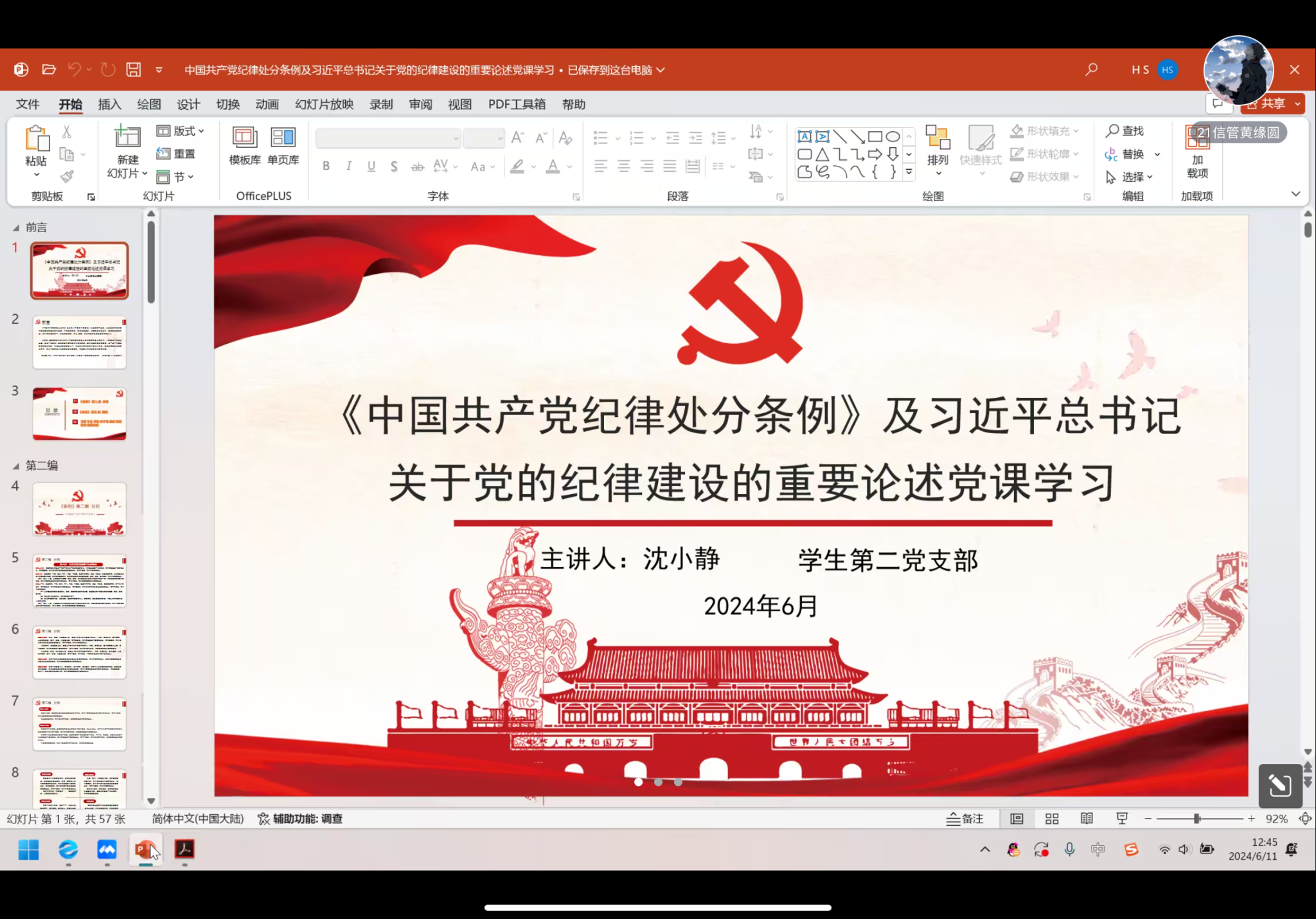 党课学习会上,支部书记沈小静同志首先带领全体党员学习了《中国共产党纪律处分条例》第二编分则的内容,带领大家对第六章和第十一章进行逐条学习,强调作为党员要自觉同以习近平同志为核心的党中央保持高度一致,统一思想、统一意志、统一行动,知行知止、令行禁止,形成推进中国式现代化的强大动力和合力。随后,沈小静同志带领支部全体党员学习了习近平总书记关于党的纪律建设的重要论述,强调广大党员要学纪、知纪、明纪、守纪,把遵规守纪印刻在心,强化纪律意识,加强自我约束,提高免疫能力。最后,支部全体同志共同学习了南宁师范大学党纪学习教育警示教育学习资料,以案为鉴,加强党纪意识。