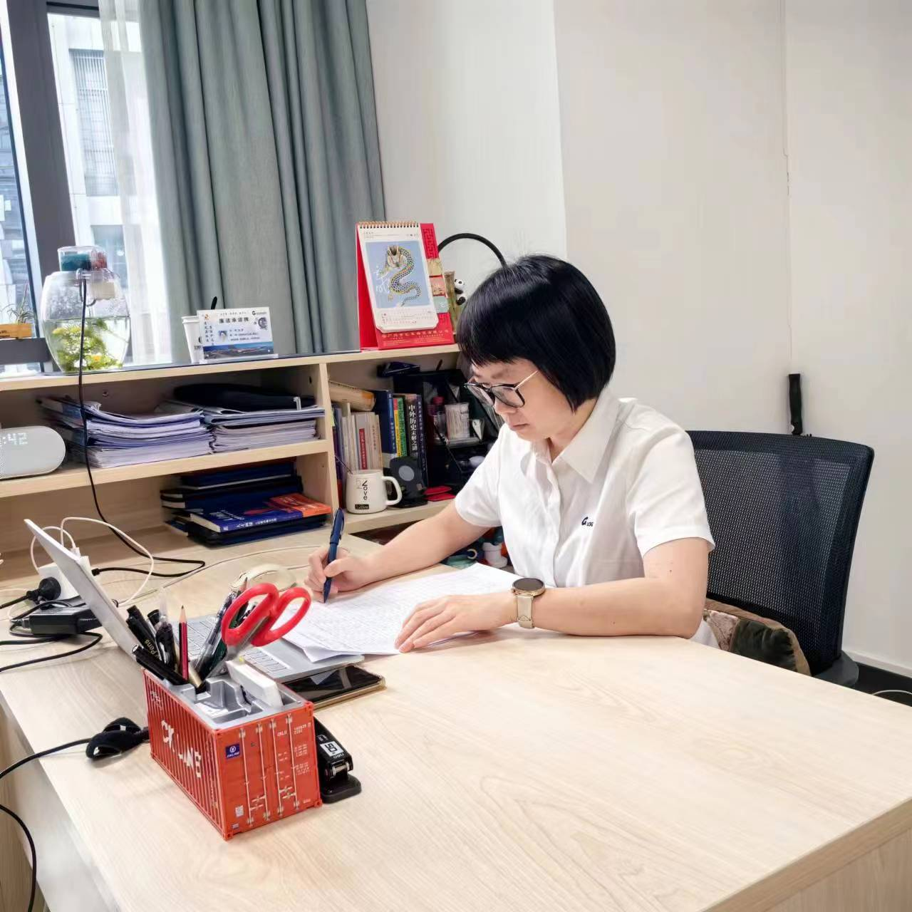 图为来自北港物流和云鸥物流的校外专家对参赛项目做认真评选