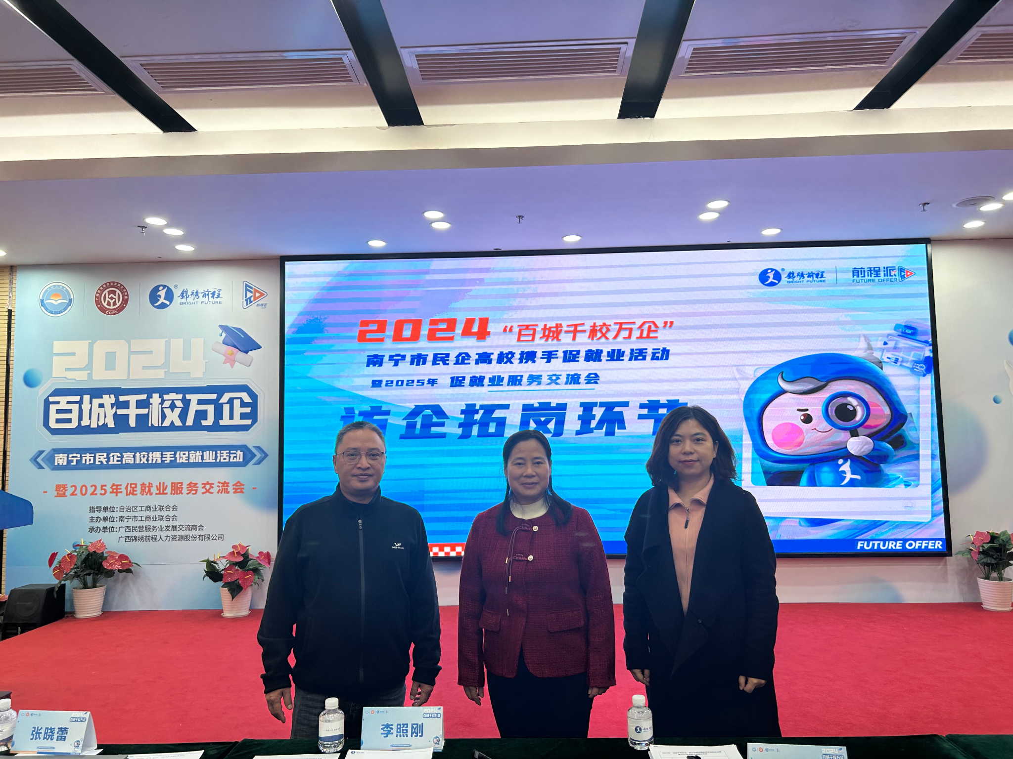 为了更好的深化与企业的合作,12月18日下午,必赢国际bwin,bwin手机版,win必赢app下载参加2024百城千校万企南宁市民企高校携手促就业活动暨2025年促就业服务交流会。本次交流会由南宁市工商业联合会主办,广西民营服务业发展交流商会、广西锦绣前程人力资源股份有限公司承办。学院党委陈兵书记、黄宇副书记,负责就业工作的辅导员共同参加了本次交流会。现场共有17家参会企业参加了本次促就业交流会。